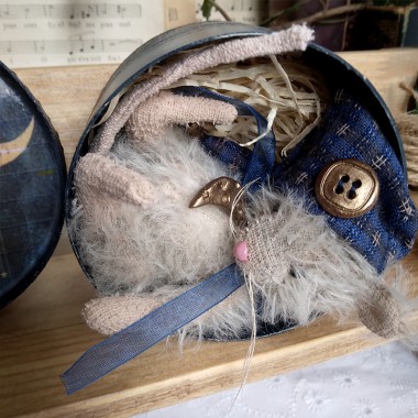 Cette souris est créée à la main dans un doux mohair, rembourrée de fibres de bois, laine de mouton et billes de verre pour son lestage. Elle est articulée (5 jeux de goupilles fendues) et ses petits yeux sont en verre noir.