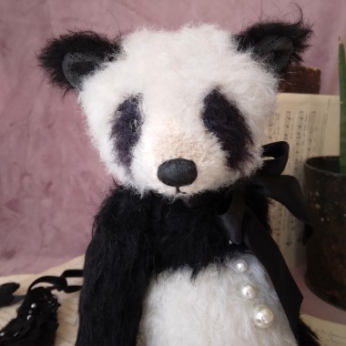 Prix 240,00 €Ce Panda se prénomme Bao ! Il saura vous attendrir avec son allure rondouillarde ! Cousu à partir de jolis mohairs allemands noir et écru, ce magnifique Panda a une fourrure dense, bouclée et pelucheuse. Son museau est sculpté, de façon à mettre ses 2 billes noirs en évidence (Yeux en verre). Son petit nez noir est cousu à la main et lustré à la cire d'abeilles. Bao est rembourré de façon traditionnelle avec fibres de bois et pure laine de mouton.