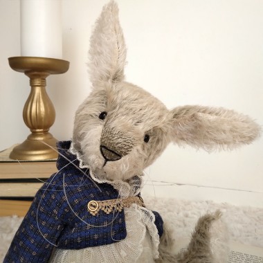 Ce lapin est fabriqué de façon traditionnelle, ses membres sont articulés. Ce lapin est rembourré avec des fibres de bois et laine de mouton, des billes de verre sont utilisées pour son lestage.Avec son apparence à la fois rustique et élégante, lapin Crocus sera un choix parfait pour les amateurs de pièces uniques et pleine de caractère.