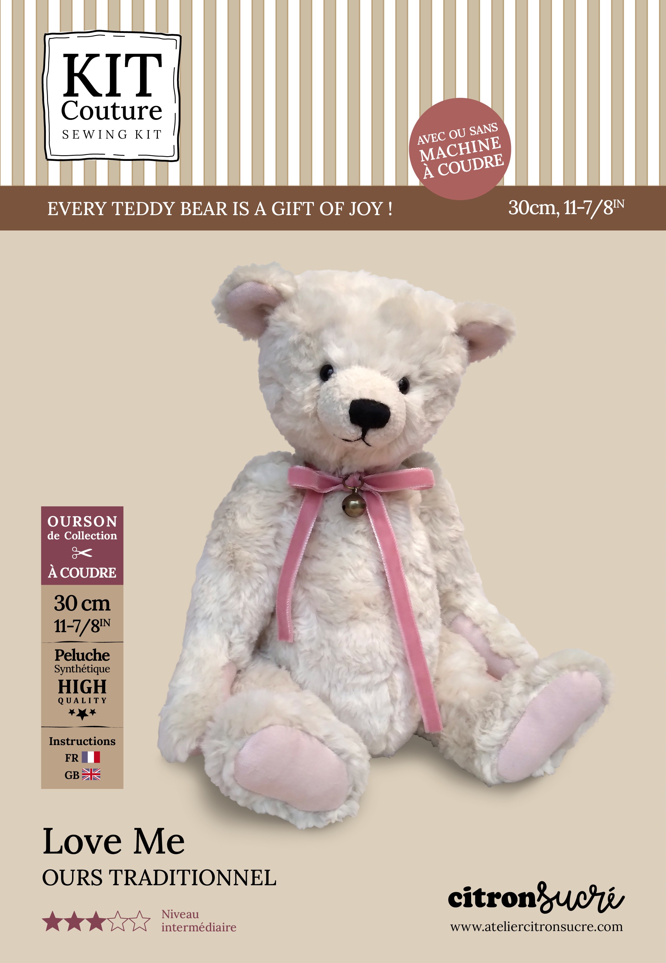 Ce kit complet contient tout le matériel nécessaire à la création de votre Oursonne, de A à Z (avec ou sans machine à coudre).