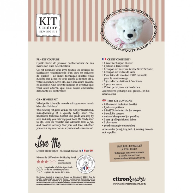 Mis en garde : L'ourson à coudre n'est pas un jouet, il est destiné aux enfants de plus de 14 ans et aux collections. Contient des éléments amovibles susceptibles d'être ingérés. Les couleurs des produits peuvent différer d’un écran à l’autre.