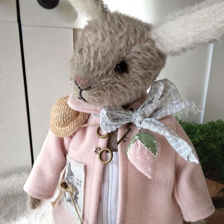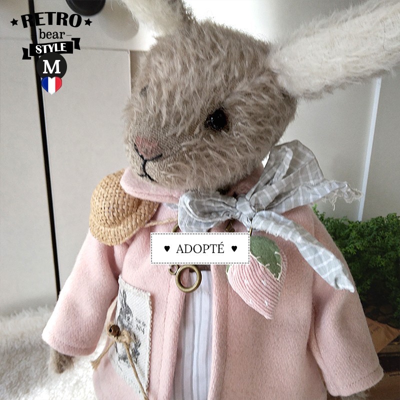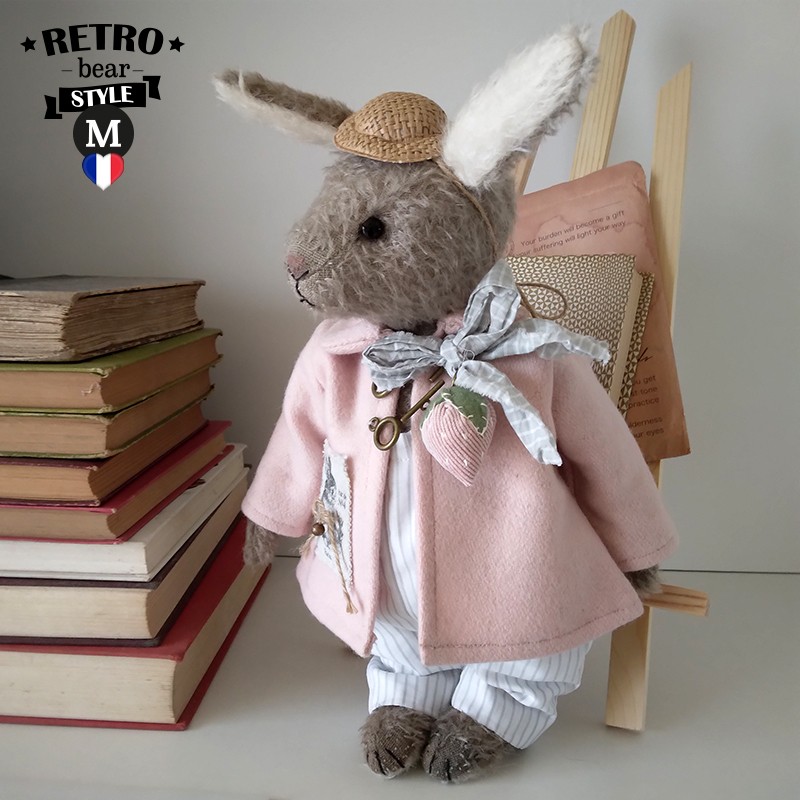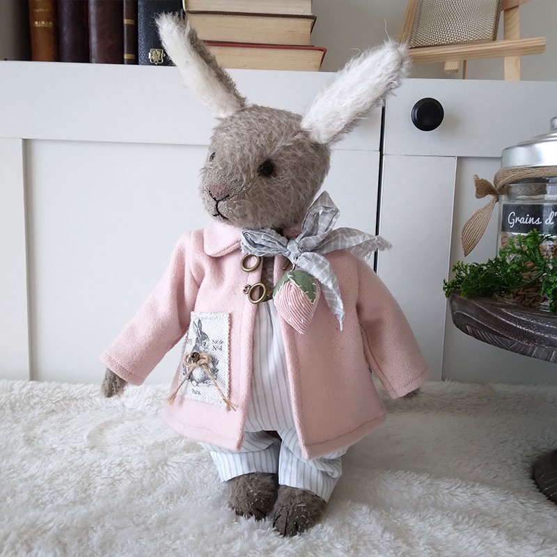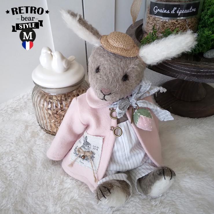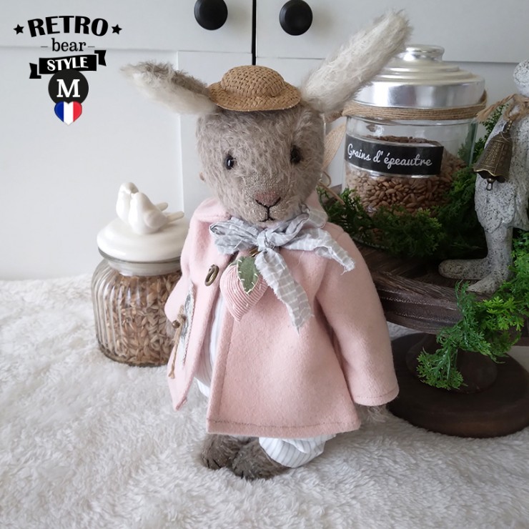 Cette jolie lapine de collection s'appelle Victoria. Elle incarne un charme vintage et une élégance raffinée. Elle est vêtue d'un manteau rose doux en laine, orné d'attaches en métal, complété par un nœud à carreaux vert d'eau pour un subtil contraste. Un détail adorable : Victoria porte en pendentif une petite fraise en velours, un clin d’œil au thème fruité et rétro. Victoria possède un petit chapeau de paille, qui peut être noué ou oté, ainsi qu'un pantalon rayé à taille élastique. Son regard expressif et ses yeux en verre noirs ajoutent une touche de douceur à son petit minois.