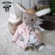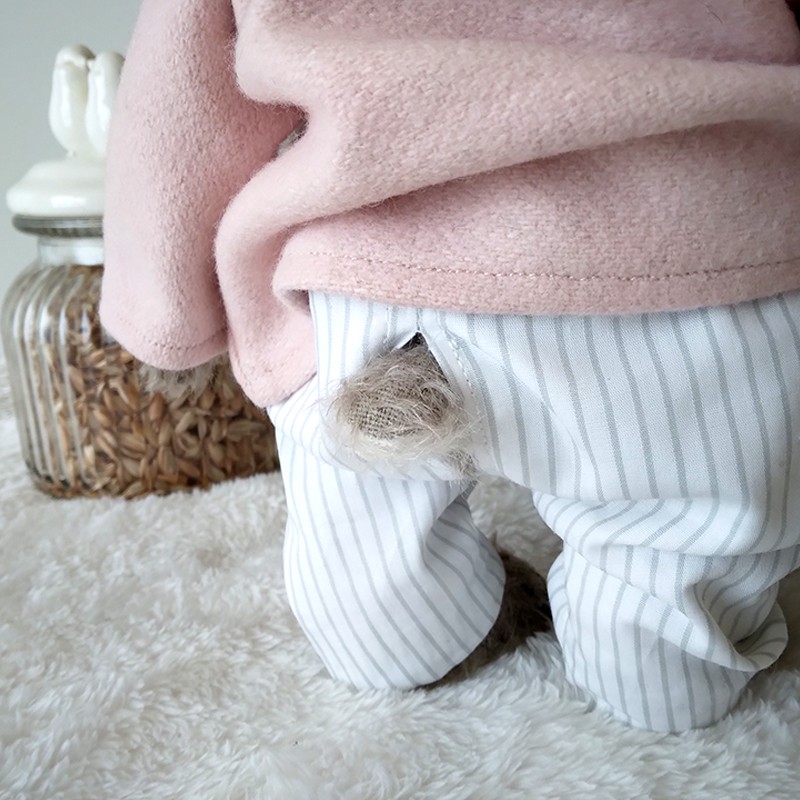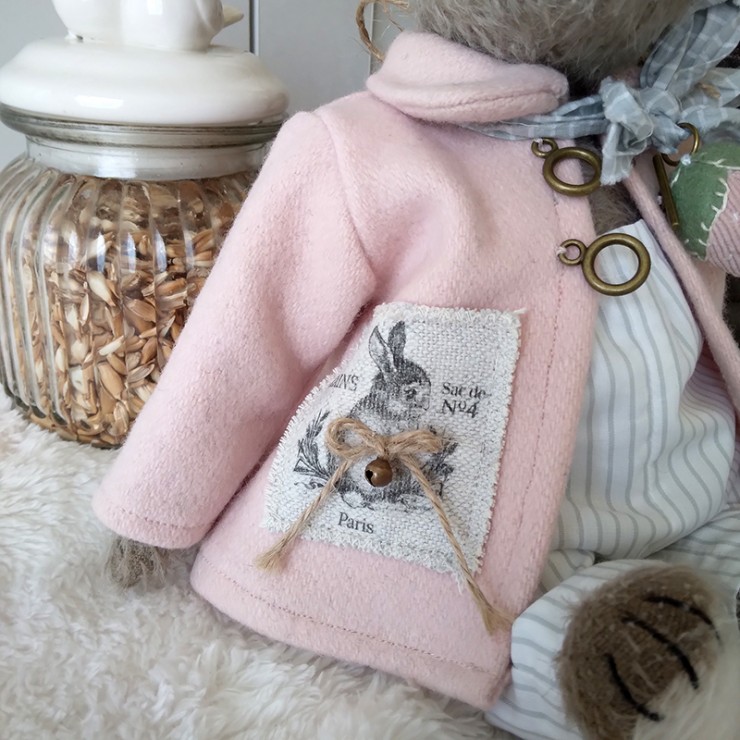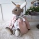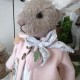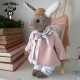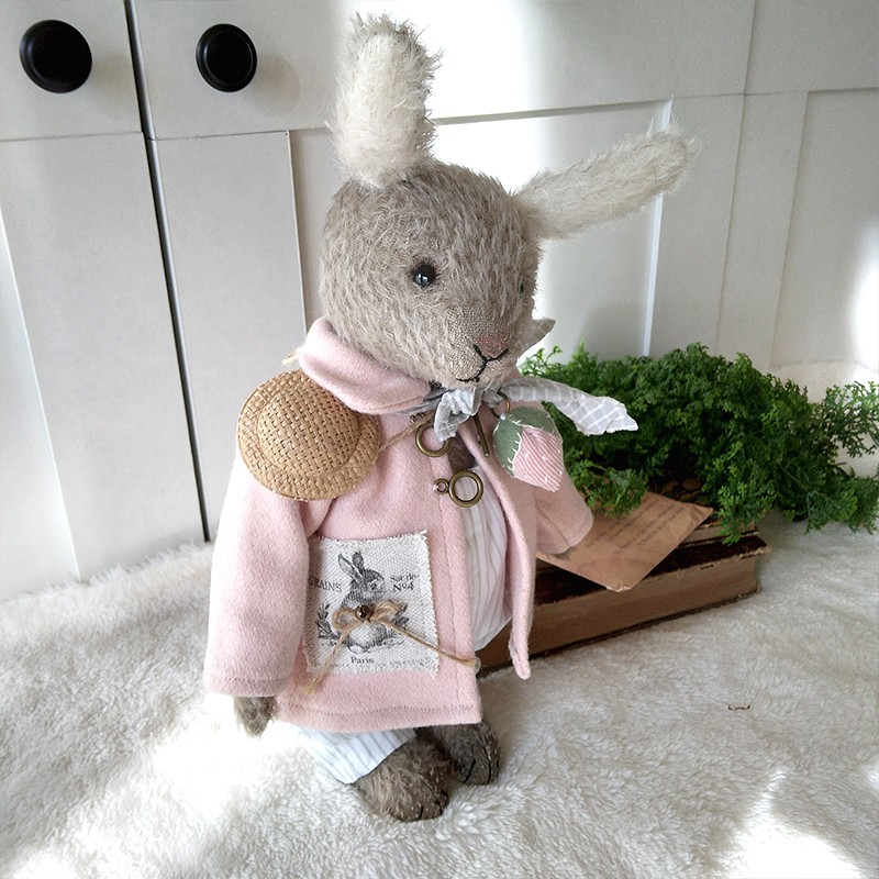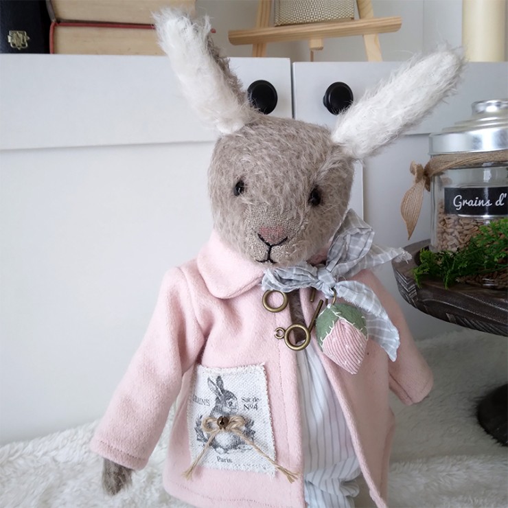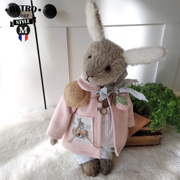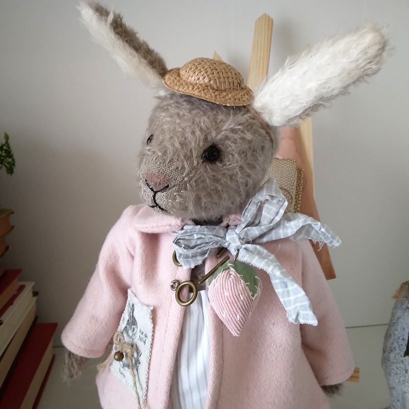 Cette jolie lapine de collection s'appelle Victoria. Elle incarne un charme vintage et une élégance raffinée. Elle est vêtue d'un manteau rose doux en laine, orné d'attaches en métal, complété par un nœud à carreaux vert d'eau pour un subtil contraste. Un détail adorable : Victoria porte en pendentif une petite fraise en velours, un clin d’œil au thème fruité et rétro. Victoria possède un petit chapeau de paille, qui peut être noué ou oté, ainsi qu'un pantalon rayé à taille élastique. Son regard expressif et ses yeux en verre noirs ajoutent une touche de douceur à son petit minois.