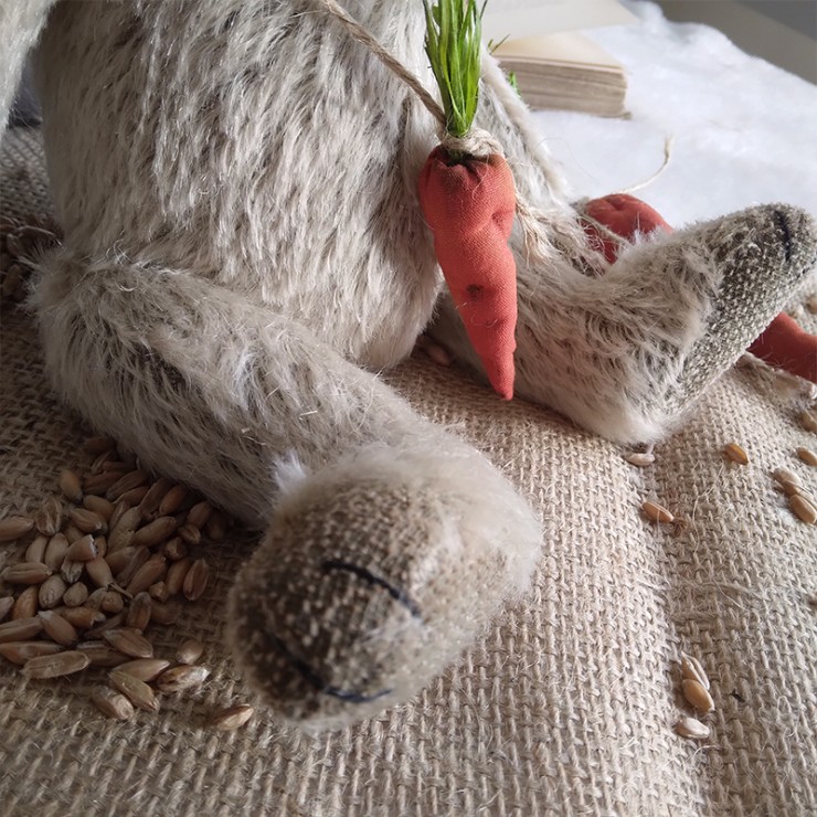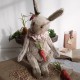 Sapho porte un col en lin, une grande carotte en collier et l'une plus petite à l'oreille comme un clin d’œil gourmand et printanier ! Ce lapin est fabriqué de façon traditionnelle et rembourré avec des fibres de bois et laine de mouton.
