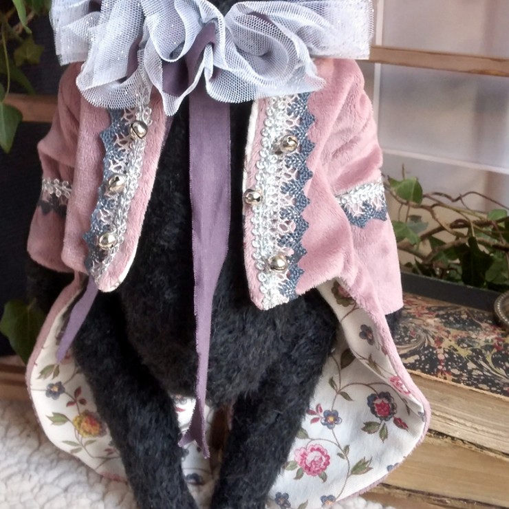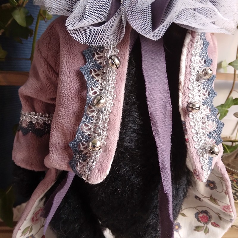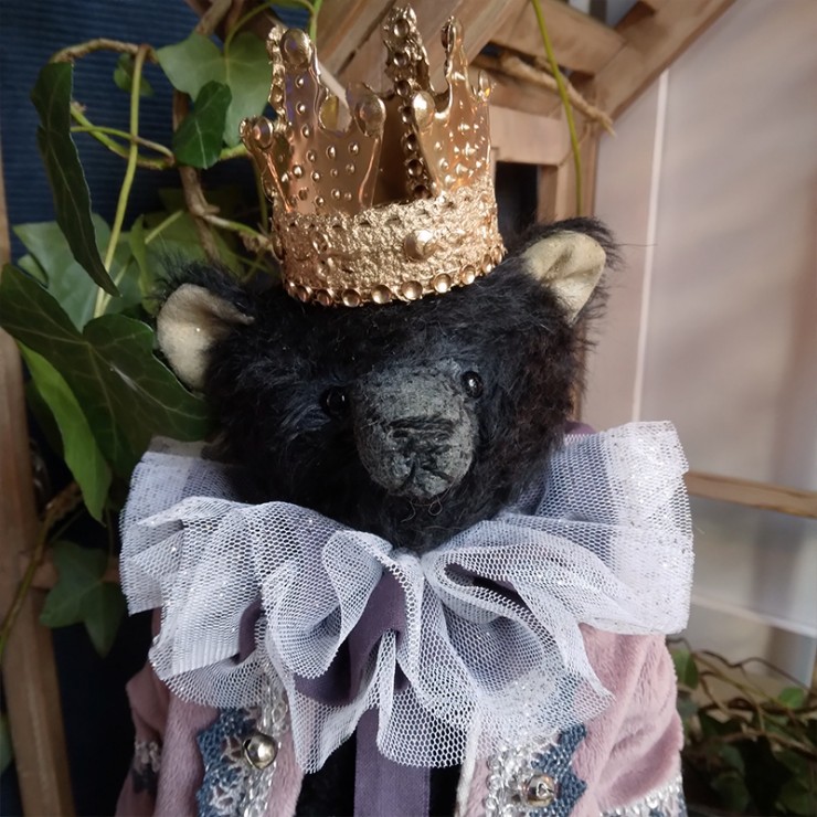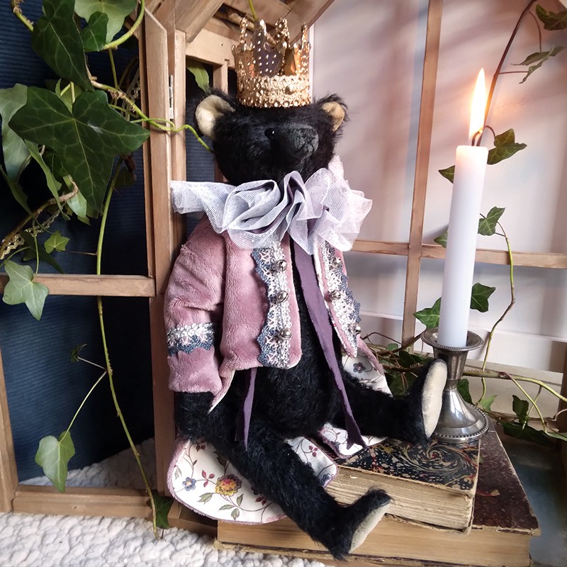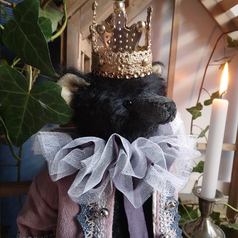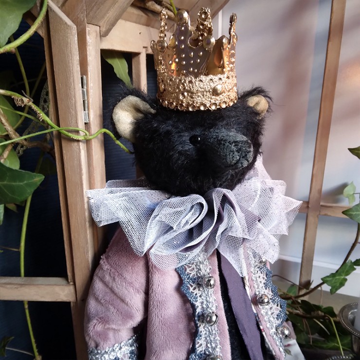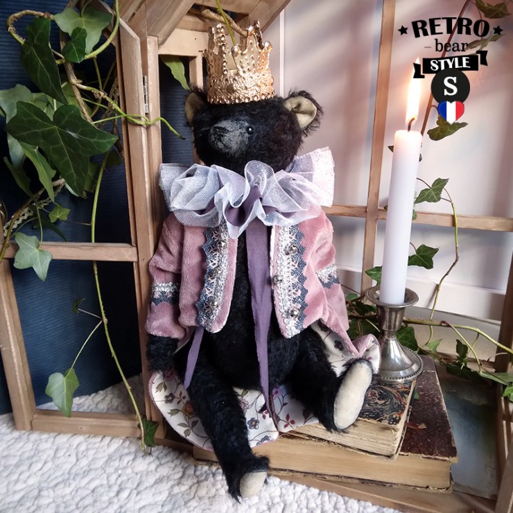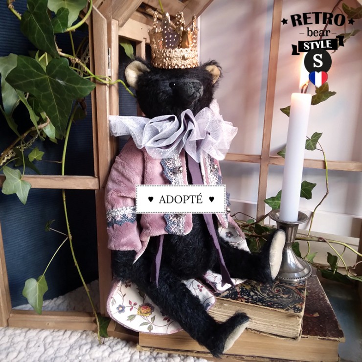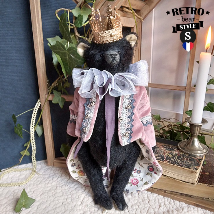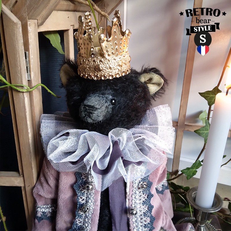 Balthazar est le nom d'un prince de Babylone et l'un des trois Rois Mages ! Ce petit ours mesure 28 cm (debout) et est confectionnée dans un mohair ras, de couleur noire (Steiff Schulte), ses yeux sont en verre. Balthazar porte une veste Royale à queue de pie de couleur rose (velours éponge) sur laquelle sont cousus grelots et dentelles - une jolie collerette en tulle souligne sa petite tête, sur laquelle se dresse une majestueuse couronne dorée ! Son museau est brodé et rehaussé de reflet doré. L'ourson est un prototype, ne tient debout qu'avec une aide. Livré avec un certificat d'authenticité.