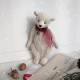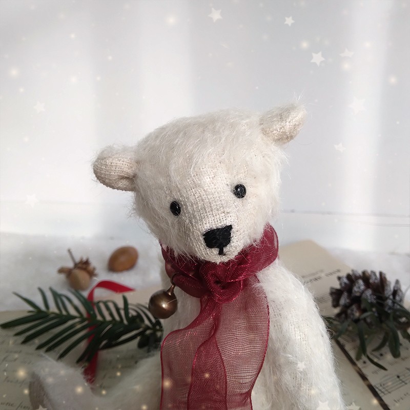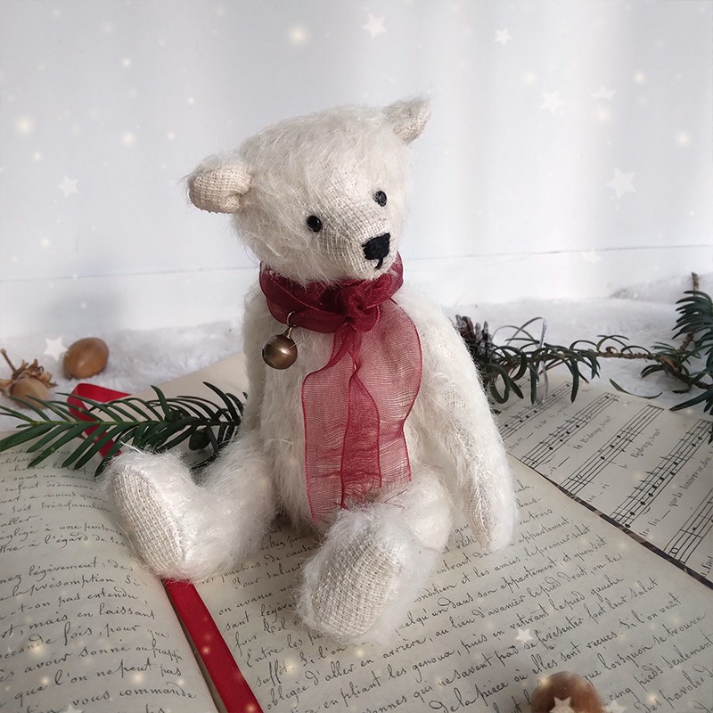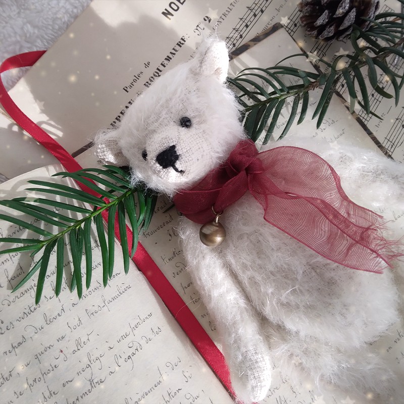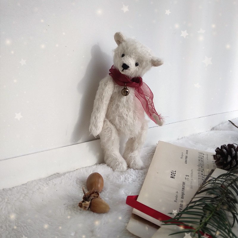 Autour du cou, Snow porte un ruban organza rouge translucide qui se termine par un petit grelot bronze, le petit détail qui évoque les carillons des fêtes de fin d'année ! Ce mini ourson est articulé, rembourré avec des fibres de bois et lesté pour une bonne tenue. Son museau est délicatement brodé.
