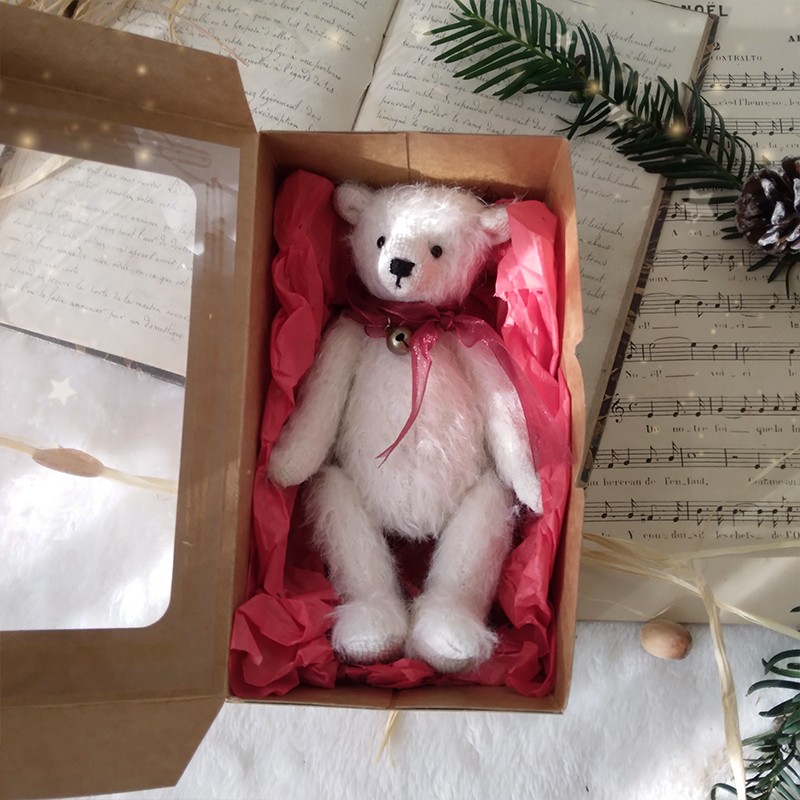 Cet délicat petit ourson semble tout droit arrivé du pôle ! Son nom : Snow ! Sa fourrure mohair blanche, légèrement duveteuse, rappelle la douceur d’un manteau de neige fraîchement tombé. Il arbore un visage tendre avec des yeux en verre noirs brillants qui expriment une grande douceur et une certaine innocence, propre à la magie de Noël.