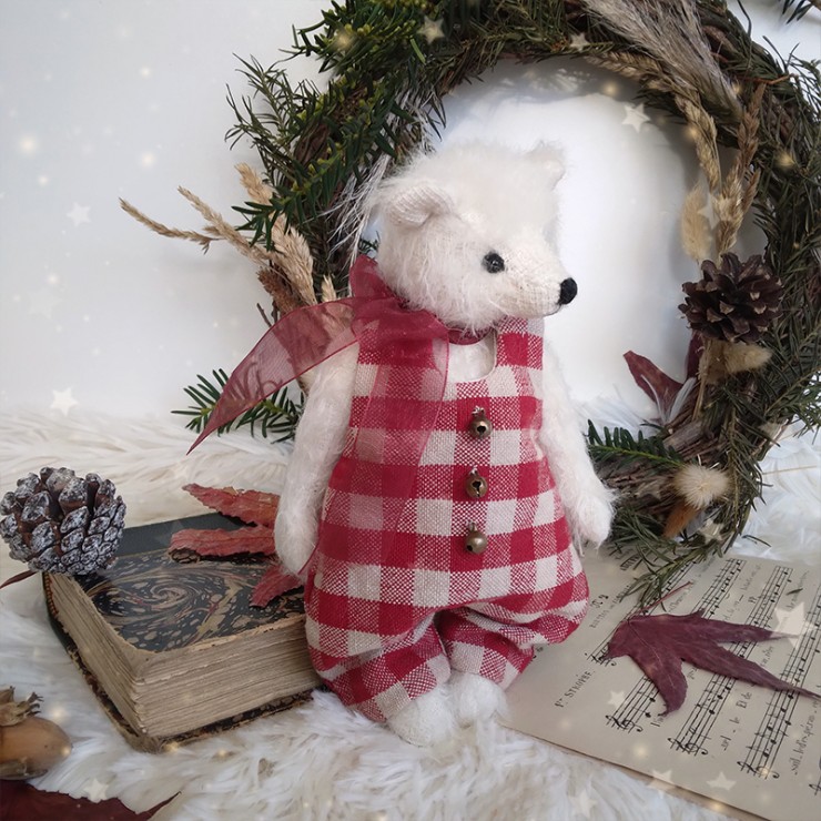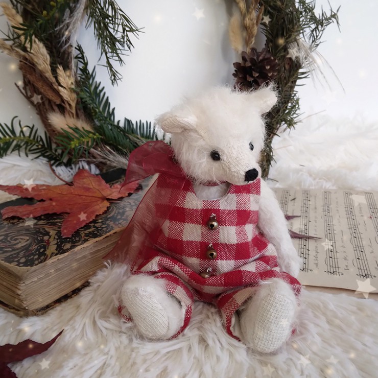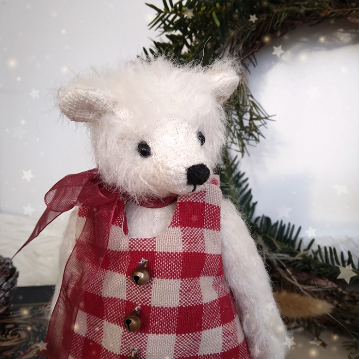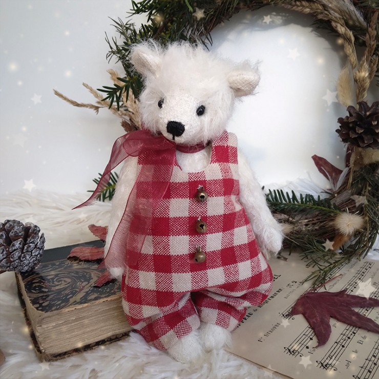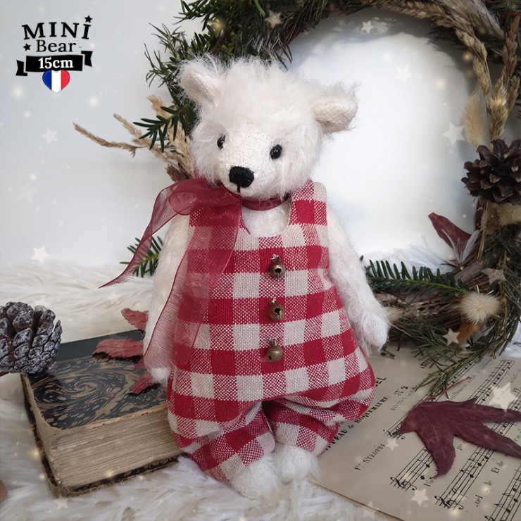 Pierre de Lune est un ravissant petit ourson de Noël parfait pour capturer l'esprit de la saison hivernale ! Il est confectionné dans une fourrure mohair à poils ras, couleur cannelle et porte une salopette en tissu à motif vichy blanc et rouge. Les trois adorables petits grelots qui l'accompagne rappelle le tintement joyeux des traîneaux du Père Noël... La salopette se ferme aux épaules grâce à deux boutons pression miniatures. Un ruban translucide en organza, noué en nœud, décore son cou.
