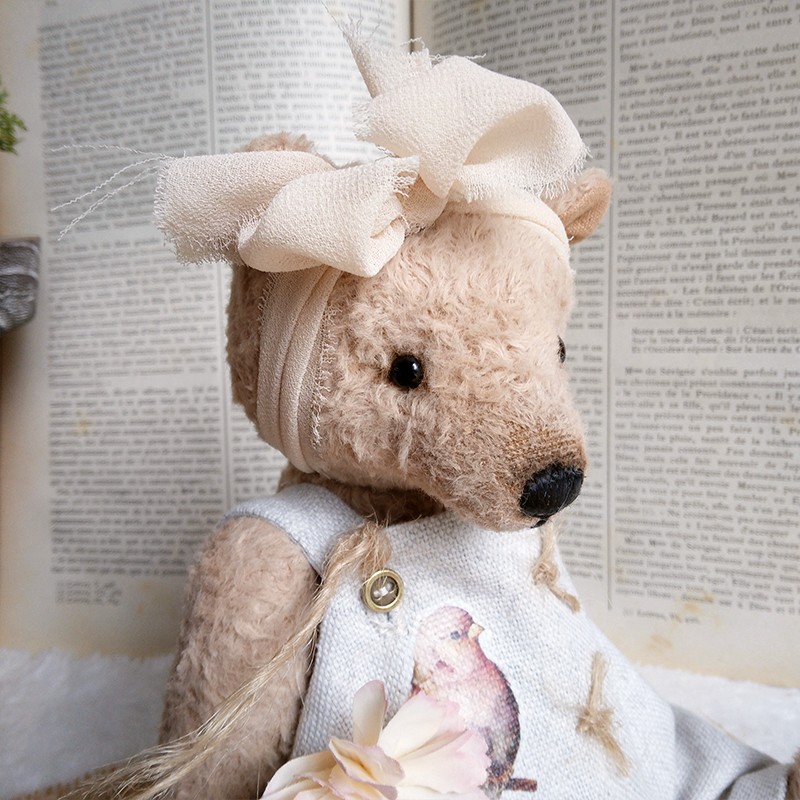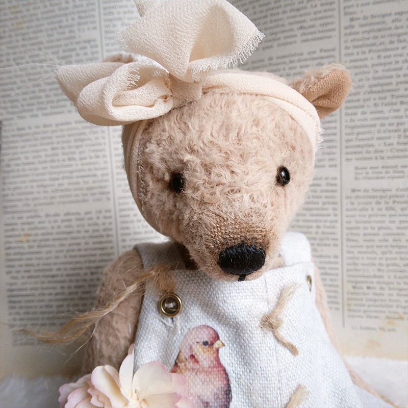 Cerise est une tendre oursonne de collection réalisée en viscose rose pâle. Elle mesure 24 cm et possède un corps peu rembourré, ce qui la rend extrêmement souple et agréable à manipuler. Son allure légèrement flasque lui confère un charme unique et une douceur irrésistible.