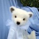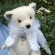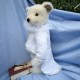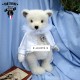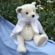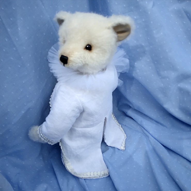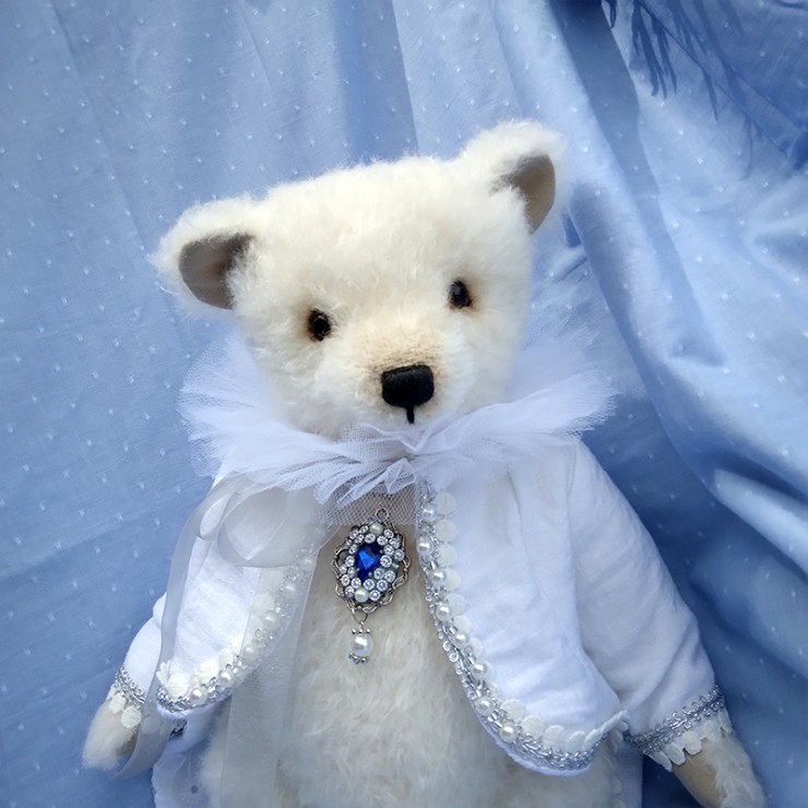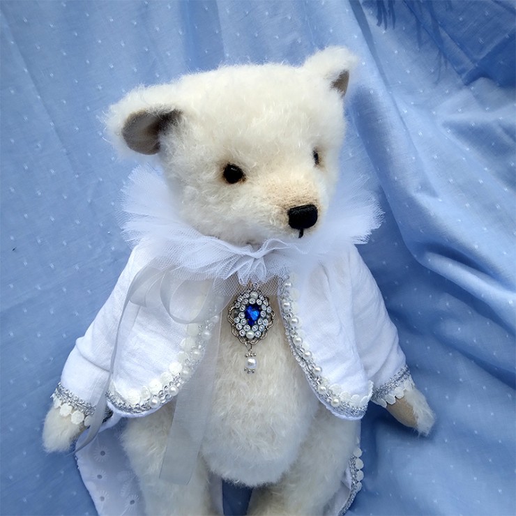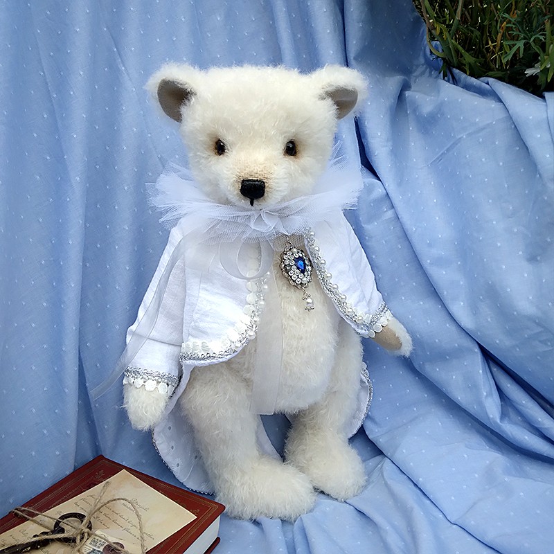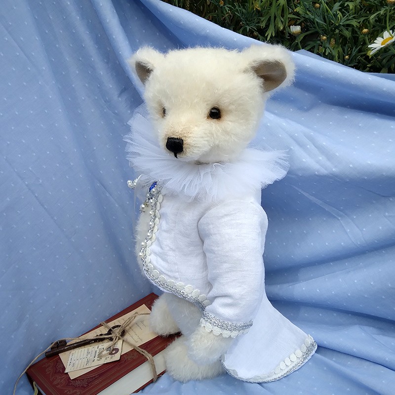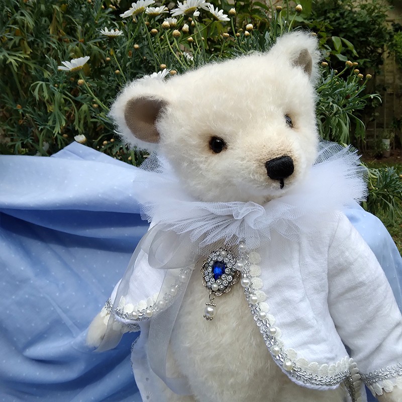 Jack et le cœur de l’océan est un ours de collection qui allie élégance et raffinement. En mohair Steiff blanc ivoire, doux et légèrement bouclé, Jack porte une redingote queue de pie blanche en lin et coton, bordée de galons perlés et de pompons nacrés. Un col vaporeux en tulle blanc vient entourer son cou, apportant une touche théâtrale et délicate. Élément central du costume — une broche en forme de médaillon serti d’un gros cabochon bleu saphir entouré de perles et de strass, évoquant clairement le célèbre « Cœur de l’Océan » du Titanic ! Les petits yeux noirs de Jack sont en verre pour une expression douce... Son museau est finement brodé et ciré.