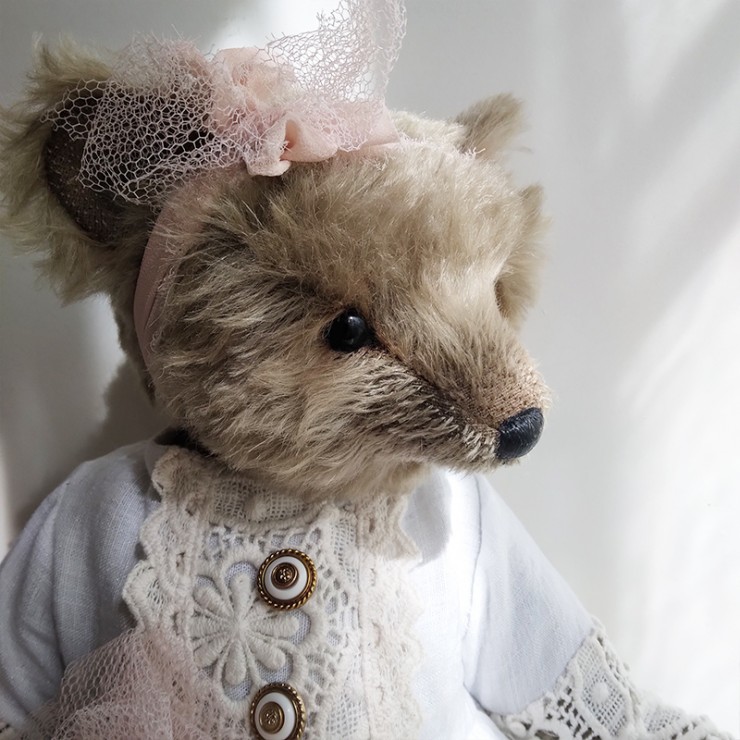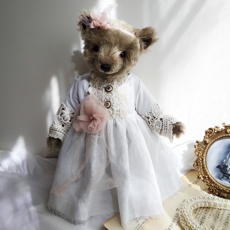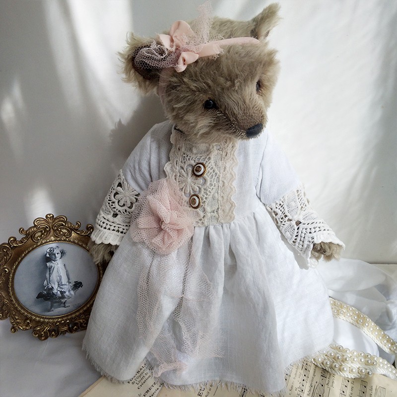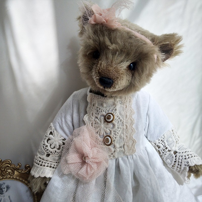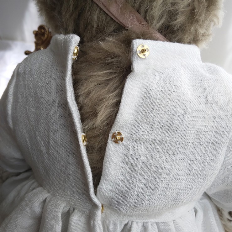 Lou porte une ravissante robe en lin blanc, soigneusement ornée de dentelles anciennes, aux motifs délicats et floraux. Les manches ajourées, les boutons anciens et la fleur en tulle rose poudré cousue à la taille accentuent son allure douce et précieuse. Un ruban en mousseline de soie est noué sur sa tête pour souligner son regard profond (yeux en verre). Le museau de cette oursonne est finement brodé et ciré, elle est rembourrée de façon traditionnelle.