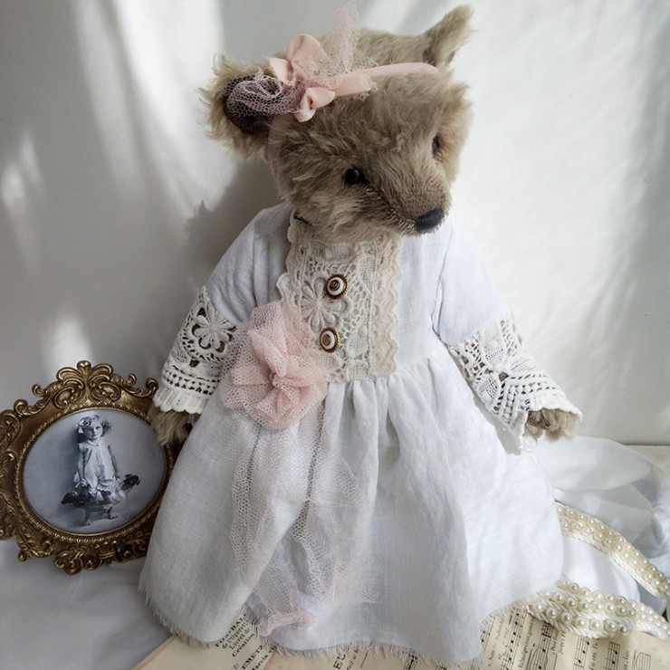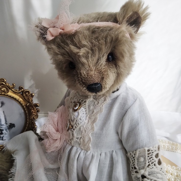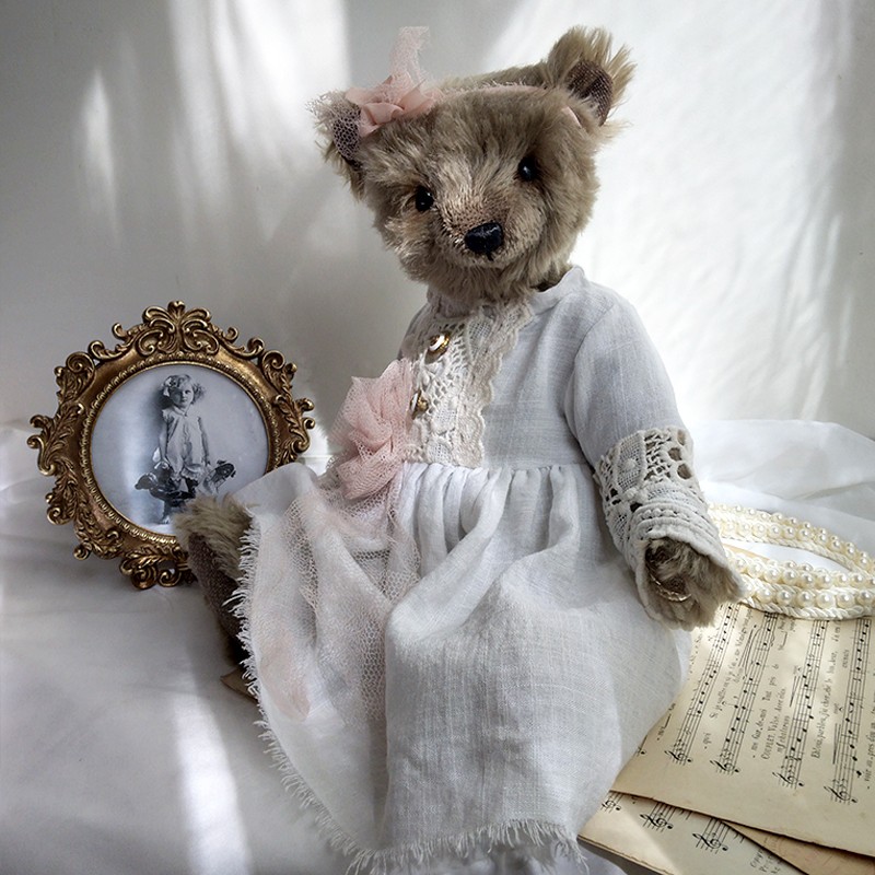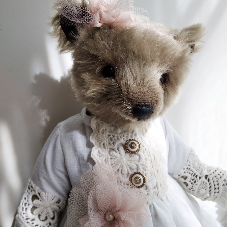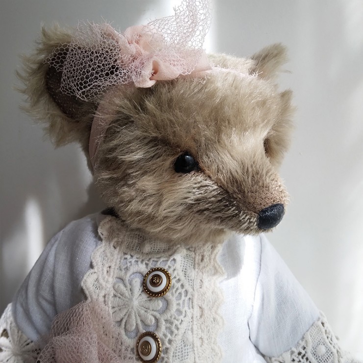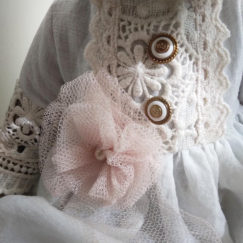 Lou porte une ravissante robe en lin blanc, soigneusement ornée de dentelles anciennes, aux motifs délicats et floraux. Les manches ajourées, les boutons anciens et la fleur en tulle rose poudré cousue à la taille accentuent son allure douce et précieuse. Un ruban en mousseline de soie est noué sur sa tête pour souligner son regard profond (yeux en verre). Le museau de cette oursonne est finement brodé et ciré, elle est rembourrée de façon traditionnelle.