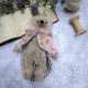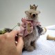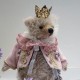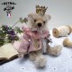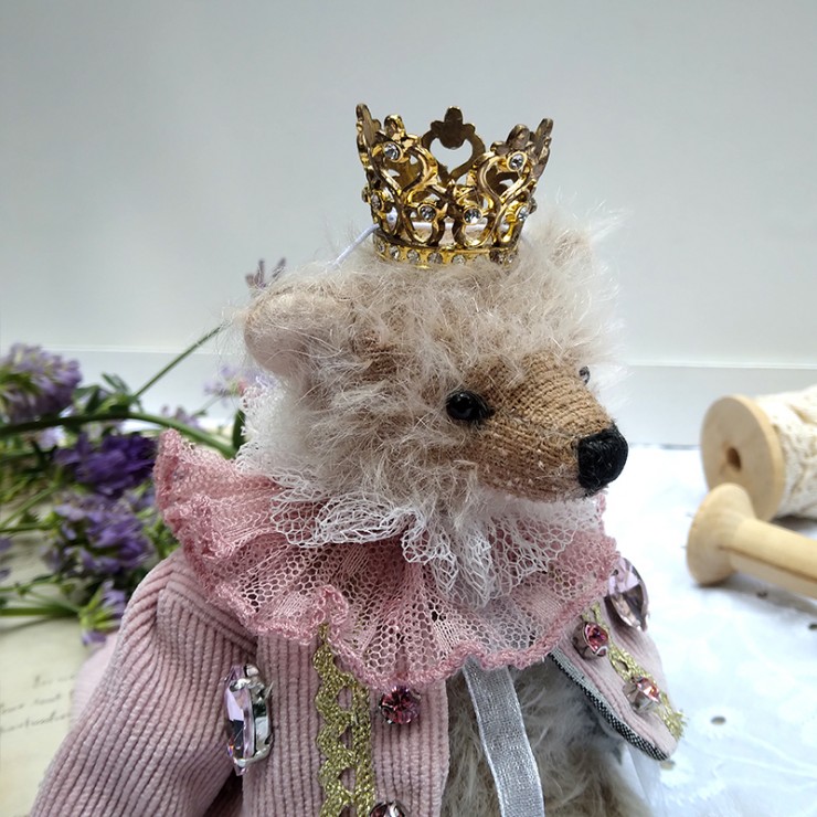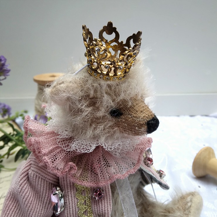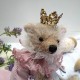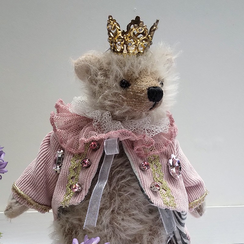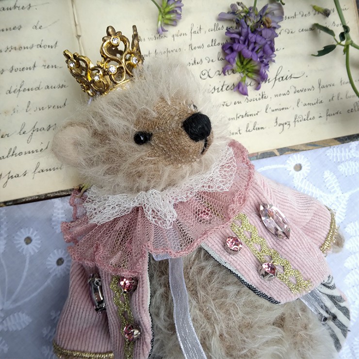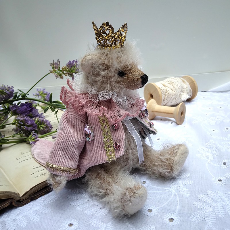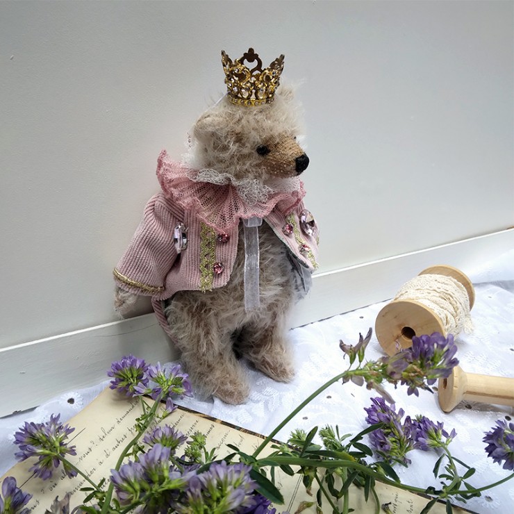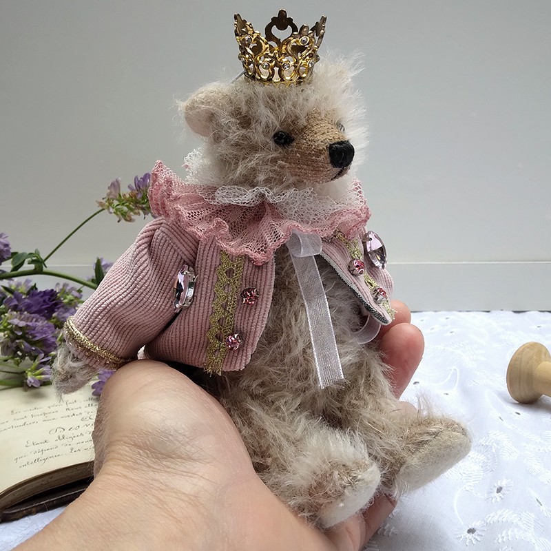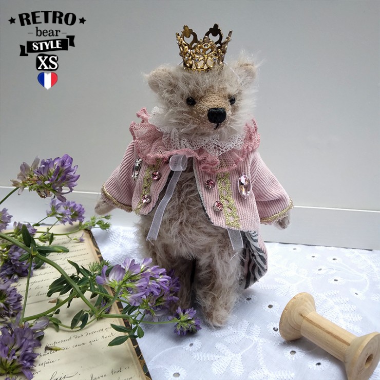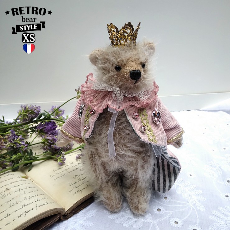 Gaufrette est un petit ours roi de 15 cm. Très tendre, il est entièrement cousu à la main et réalisé en mohair bouclé crème, au charme délicieusement vieilli. Il porte une redingote en velours rose poudré, ornée de strass, galons dorés et d’un col en tulle rose et blanc cassé, dans un esprit baroque assumé. Sa silhouette royale est couronnée d’un délicat diadème en métal doré. Gaufrette est rembourré avec des fibres de bois de façon traditionnelle. Ses yeux sont en verre. Articulé et légèrement lesté, ce précieux petit roi de théâtre est une pièce unique, pleine de caractère, parfaite pour les collectionneurs d’âmes !