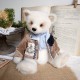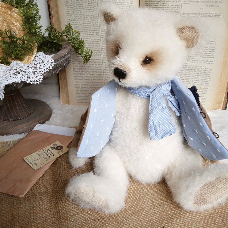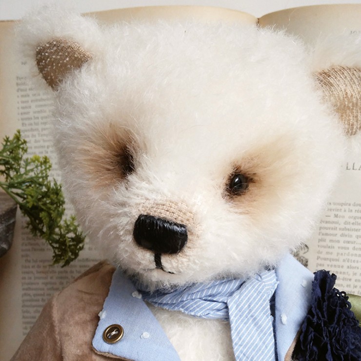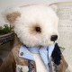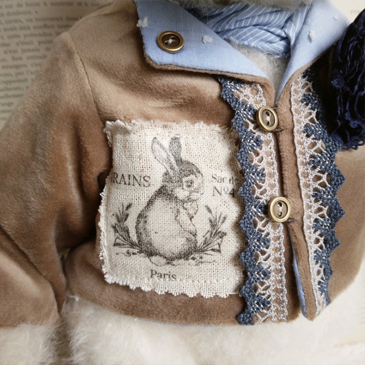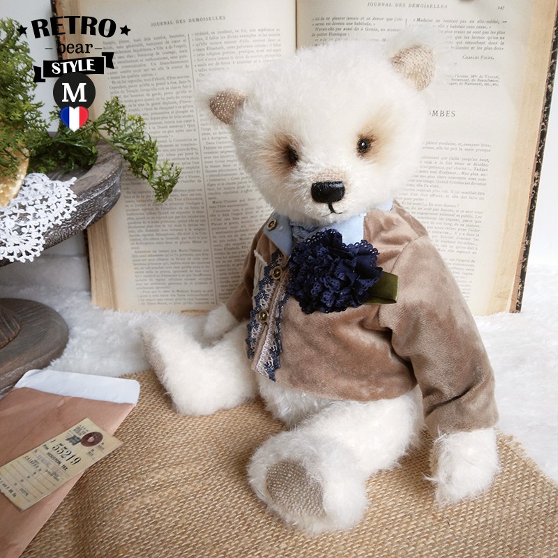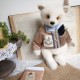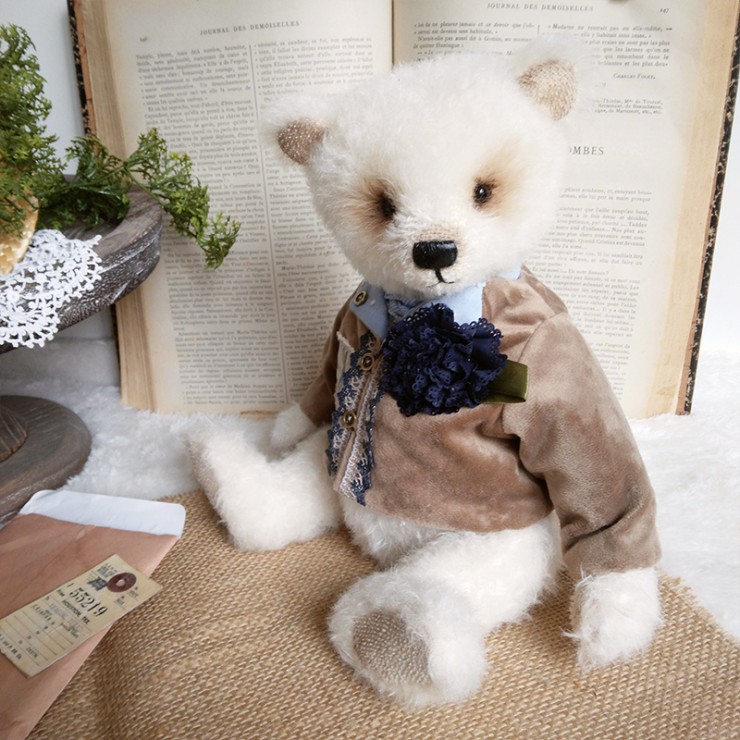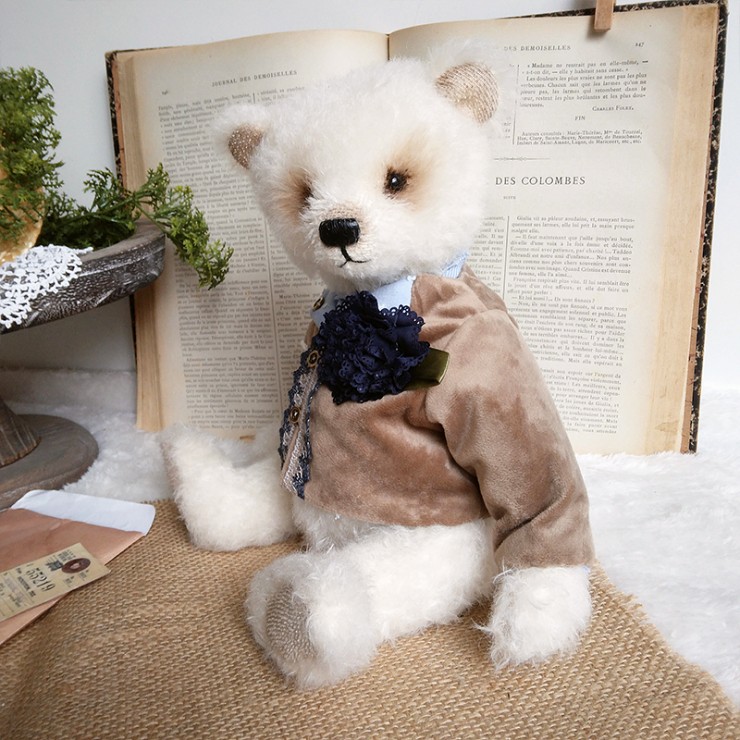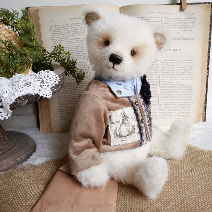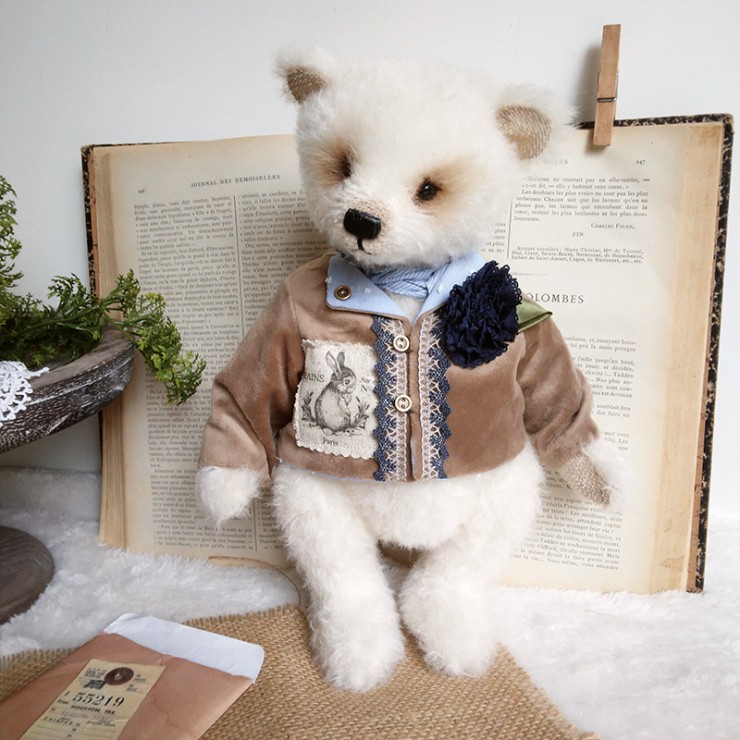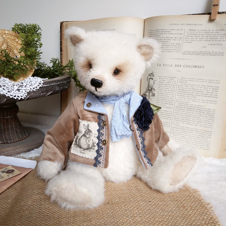 Cet ours charmant s'appelle Romain, mesure 32 cm et est confectionné dans un mohair dense et blanc. Son regard tendre et expressif lui confère un charme indéniable ! Romain porte un veste en velours beige, ornée de broderies et de dentelle bleue, avec une adorable illustration d'un lapin sur le côté ajoutant une touche d'originalité et de nostalgie à sa tenue. Il est également doté d'un foulard bleu clair et d'une fleur en tissu bleu marine.