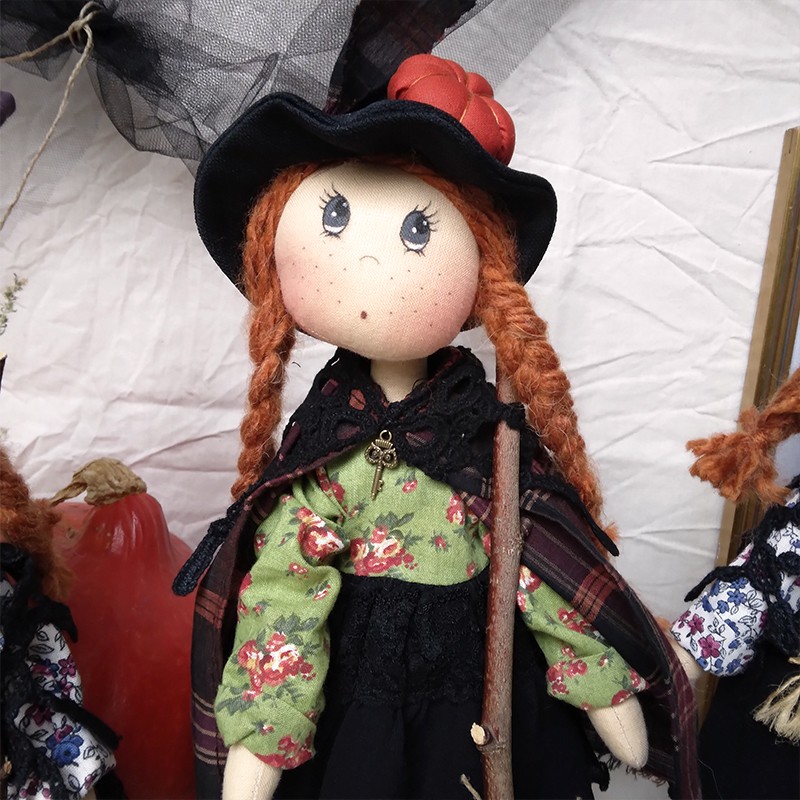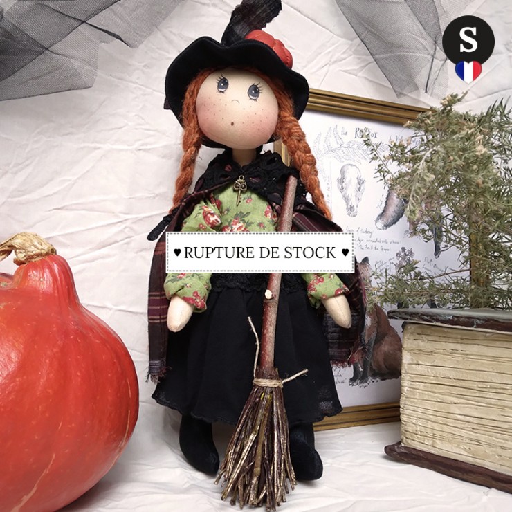 Tina Tonnerre est une petite sorcière (26/27 cm) de décoration, au look un peu vintage. A ne pas confondre avec la fameuse Turner Tina, qui elle, dansait le rock n'roll ! Mais cette adorable petite poupée saura veiller sur vous et votre maisonnée. Une légende raconte que suspendre une petite sorcière dans la maison conjure le mauvais sort ! Tina tient debout et porte sur ses jolies tresses rousses, un chapeau citrouille (non amovible), une jolie petite robe de sorcière, dans les tons vert et noir. Au cou, une petite clé antique (sans doute la clé de la cave).