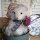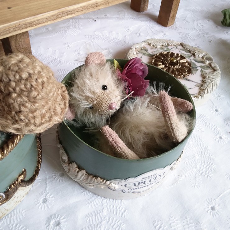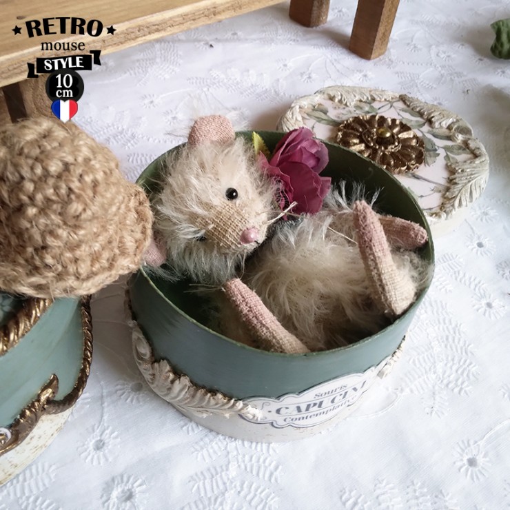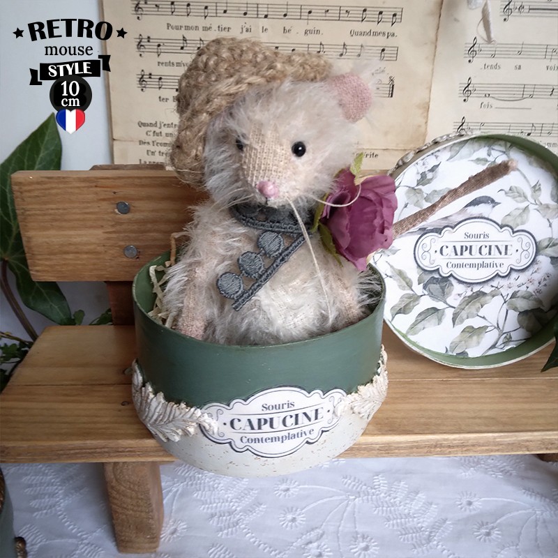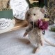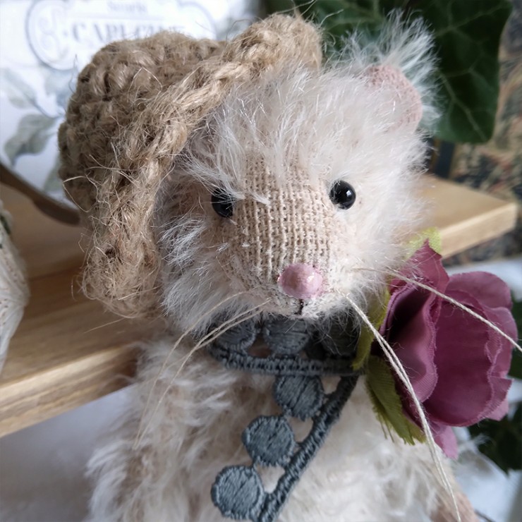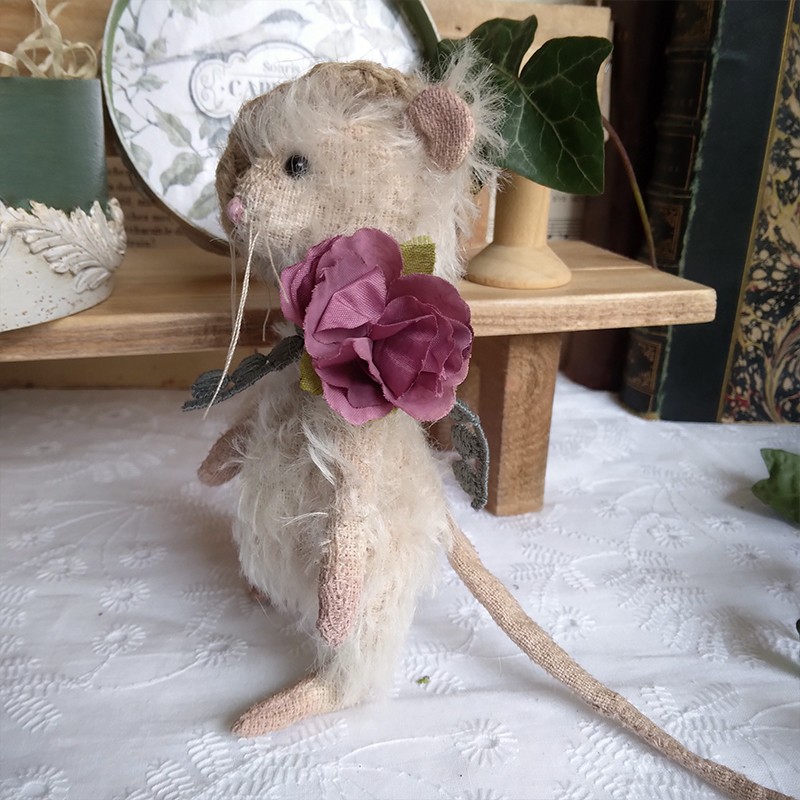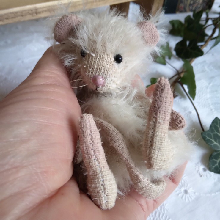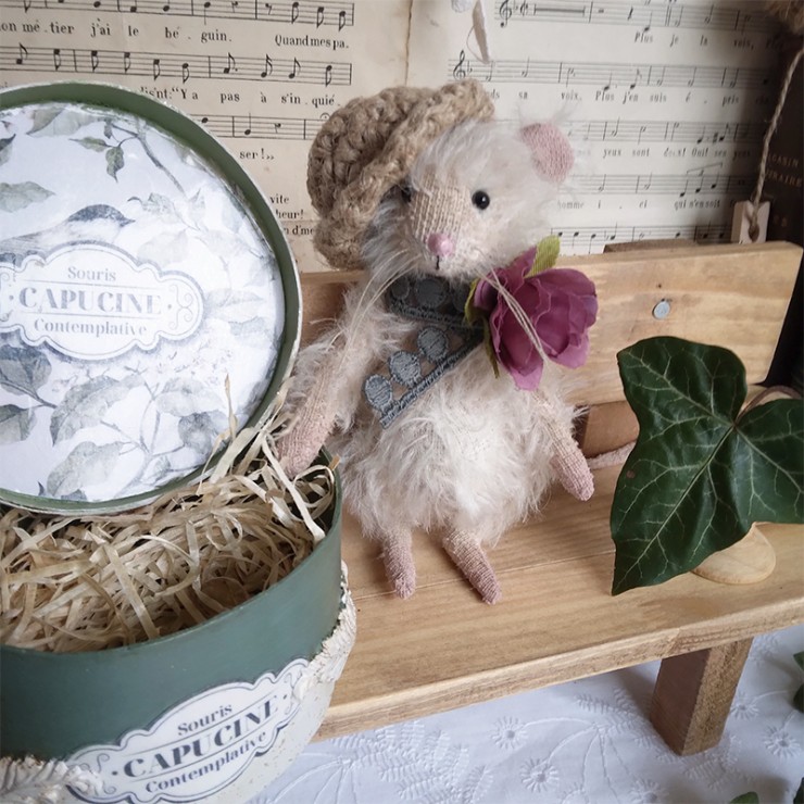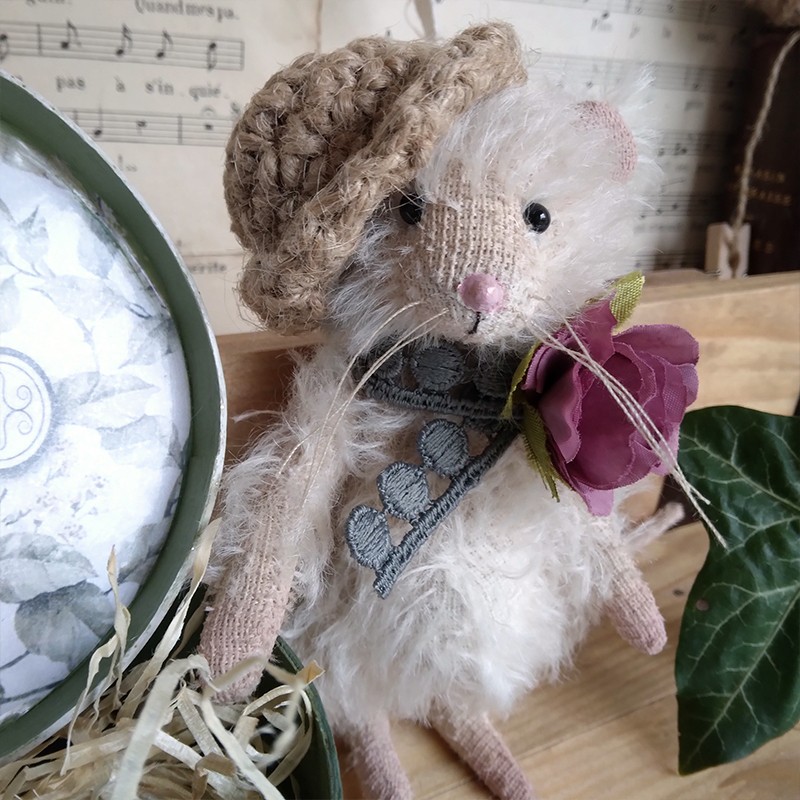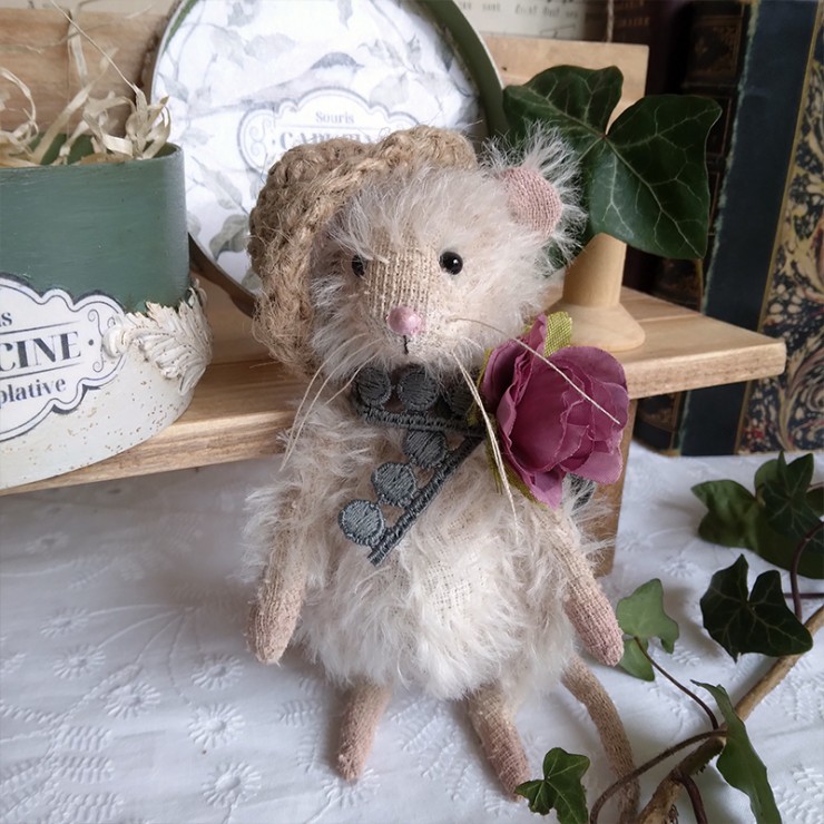 Cette souris est créée à la main dans un doux mohair, rembourrée de fibres de bois, laine de mouton et billes de verre pour son lestage. Elle est articulée (5 jeux de goupilles fendues) et ses petits yeux sont en verre noir.