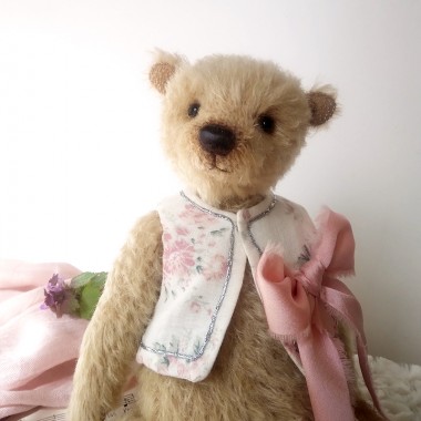 Price €200.00Ernest est un ourson tout doux, de 36 cm. Il porte de ravissants vêtements aux couleurs de l'automne. Sa veste en velours noisette, est doublée d'un joli coton fleuri. Elle se ferme entièrement avec 4 boutons. Son cache col, en tricot tissé permettra à Ernest d'affronter le froid cet hiver ! Un grelot accroché à la boutonnière tintine gentiment. Cet ourson possède deux yeux noirs en verre et est confectionné dans un mohair très doux (Steiff Schulte), de couleur beige cendré. Son museau est brodé et lustré à la cire d'abeilles. Livré avec un certificat d'authenticité.