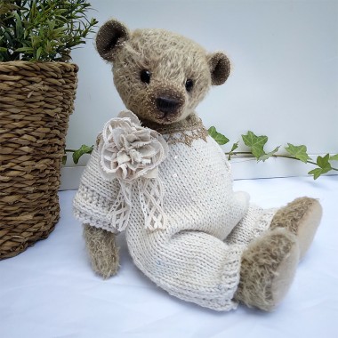 Price €190.00Avec son allure débonnaire, ours Boston a tout pour plaire ! Ce charmant nounours mesure 38 cm environ, il est confectionné main dans un joli mohair Steiff Schulte couleur sable. Boston porte un gros nœud papillon en lainage pour un style délicieusement rétro, et un chandail écru tricoté main, fermé par 2 boutons en bois. Boston porte sa clé au cou, au bout d'une chaine. La clé du coffre de la banque peut-être !! Cet ours est rembourré avec des copeaux de bois et des billes minérales pour son lestage, ses jolis yeux mordorés sont en verre, le museau brodé et lustré à la cire d'abeilles. Boston est une pièce unique ! Livré avec son certificat d'authenticité.