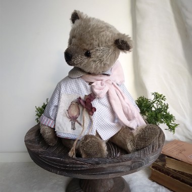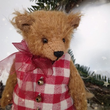 Price €140.00Ernest est un ourson tout doux, de 36 cm. Il porte de ravissants vêtements aux couleurs de l'automne. Sa veste en velours noisette, est doublée d'un joli coton fleuri. Elle se ferme entièrement avec 4 boutons. Son cache col, en tricot tissé permettra à Ernest d'affronter le froid cet hiver ! Un grelot accroché à la boutonnière tintine gentiment. Cet ourson possède deux yeux noirs en verre et est confectionné dans un mohair très doux (Steiff Schulte), de couleur beige cendré. Son museau est brodé et lustré à la cire d'abeilles. Livré avec un certificat d'authenticité.