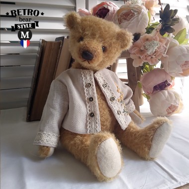 Price €100.00Ernest est un ourson tout doux, de 36 cm. Il porte de ravissants vêtements aux couleurs de l'automne. Sa veste en velours noisette, est doublée d'un joli coton fleuri. Elle se ferme entièrement avec 4 boutons. Son cache col, en tricot tissé permettra à Ernest d'affronter le froid cet hiver ! Un grelot accroché à la boutonnière tintine gentiment. Cet ourson possède deux yeux noirs en verre et est confectionné dans un mohair très doux (Steiff Schulte), de couleur beige cendré. Son museau est brodé et lustré à la cire d'abeilles. Livré avec un certificat d'authenticité.