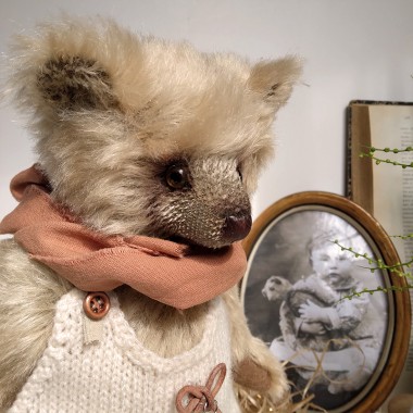 Price €160.00Lucas est un adorable petit ourson "gavroche" de 24 cm. Sa barboteuse est tricotée main, dans une fine laine gris pâle, agrémentée de boutons miniatures en métal, se ferme au dessus des épaules. Son foulard rayé noué au cou est assorti à la doublure de sa casquette velours. Lucas porte une petite clé rétro en pendentif. Cet ourson est confectionné dans un mohair Steiff Schulte couleur beige doré. Son corps est assemblé avec des goupilles qui permettent le mouvement. Lucas est rembourré de façon traditionnelle avec copeaux et fibres de bois. Des billes minérales pour le lestage. Ses yeux sont en verre. A adopter d'urgence ! Livré avec son certificat d'authenticité.