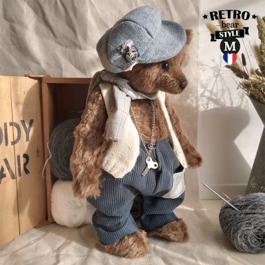 Price €160.00Lucas est un adorable petit ourson "gavroche" de 24 cm. Sa barboteuse est tricotée main, dans une fine laine gris pâle, agrémentée de boutons miniatures en métal, se ferme au dessus des épaules. Son foulard rayé noué au cou est assorti à la doublure de sa casquette velours. Lucas porte une petite clé rétro en pendentif. Cet ourson est confectionné dans un mohair Steiff Schulte couleur beige doré. Son corps est assemblé avec des goupilles qui permettent le mouvement. Lucas est rembourré de façon traditionnelle avec copeaux et fibres de bois. Des billes minérales pour le lestage. Ses yeux sont en verre. A adopter d'urgence ! Livré avec son certificat d'authenticité.