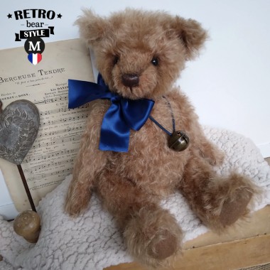 Price €150.00Ernest est un ourson tout doux, de 36 cm. Il porte de ravissants vêtements aux couleurs de l'automne. Sa veste en velours noisette, est doublée d'un joli coton fleuri. Elle se ferme entièrement avec 4 boutons. Son cache col, en tricot tissé permettra à Ernest d'affronter le froid cet hiver ! Un grelot accroché à la boutonnière tintine gentiment. Cet ourson possède deux yeux noirs en verre et est confectionné dans un mohair très doux (Steiff Schulte), de couleur beige cendré. Son museau est brodé et lustré à la cire d'abeilles. Livré avec un certificat d'authenticité.